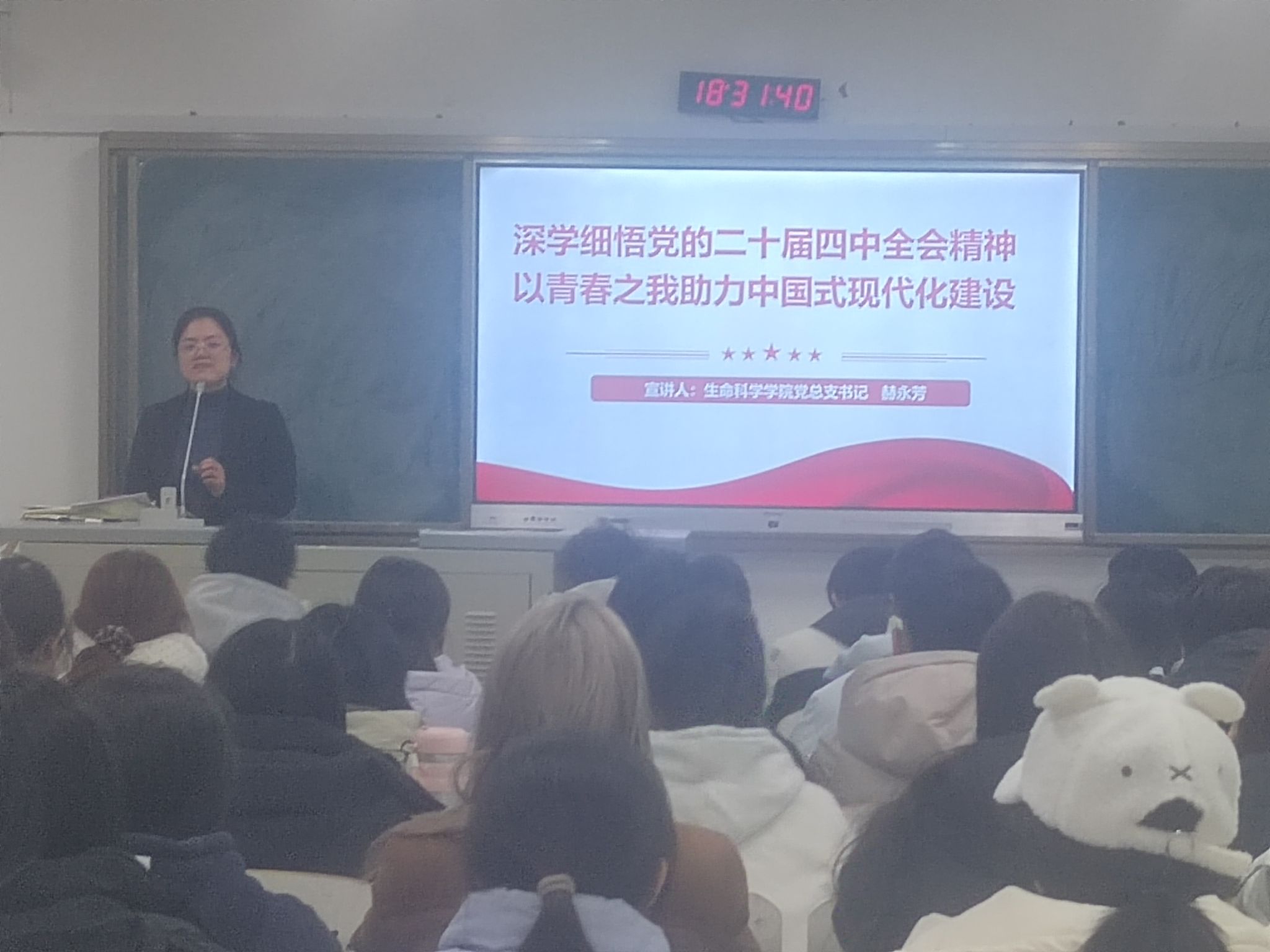 为将党的二十届四中全会精神融入课堂教学,入脑入心,12月16日晚上,我院党总支书记赫永芳在文汇楼C312教室,为我院2025级部分学生上了一节深入浅出、生动活泼的形势与政策课。