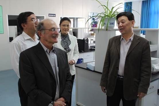 2012年10月23日中国工程院院士,河南农业大学校长张改平(右1)祝贺分子生物学实验室成立