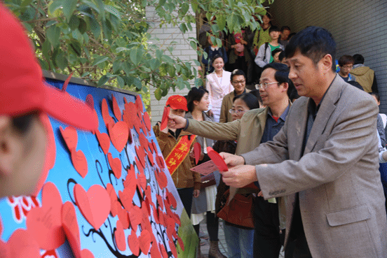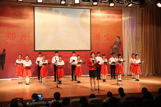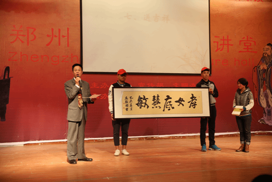 本次道德讲堂共分省自身、诵经典、学模范、发善心、唱歌曲、崇德躬、送吉祥、一堂一善事八个环节。活动开始,全体起立,随着舒缓的音乐,在主持人的引导下,闭目反省对父母的孝道。接着,在全场师生共同诵读《孝经纪孝行章第十》孝子之事亲片段后,郑州师范学院师生志愿者深情合诵了《爱,擦亮天空献给孝女底慧敏》,以朴实的语言、诗歌的形式为观众描绘出一个柔弱而又坚强、孝顺的女孩。然后,底慧敏讲述了她带母求学、孝敬父母,面对困难不屈不挠、自强自立的感人经历,学院党总支副书记周红杰讲述了帮扶过程,现场观众无不动容,深受感动和启发。学生代表上台发言,分享了我眼中的底慧敏,表达了以底慧敏为榜样,孝顺父母,回报社会的态度和想法。生科2班全体师生合唱歌曲《和你一样》,通过歌声传达真挚的情感,共同向无数伸出援助之手的各界人士表示感谢。随后,全体起立,心怀崇德之心共同向代表中华传统美德的老子像深深鞠躬,心灵受到了道德的洗礼。最后,现场师生们在自制红心卡片上留言,写下内心的感触和对底慧敏的祝福,并贴到活动现场的爱心树上,送吉祥给这位善良、坚强的女孩。学校马敬国老师将书法作品孝女底慧敏赠送给底慧敏。全场洋溢着崇德向善的浓厚氛围。会后,生命科学学院将于4月25日赴二七区恒爱敬老院开展关爱老人志愿活动。