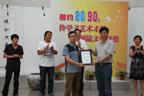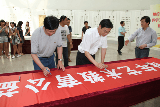 在仪式上,学校党委副书记弓民致辞,对参加笔会的领导嘉宾表示热烈欢迎,他说,书法艺术是中国的国粹,是我国传统文化的璀璨瑰宝。加强大学生书法艺术教育,增添校园文化色彩,是师生欣赏和享受的文化美羹。他鼓励青年学生通过鉴书赏字、品章评句,提高书法艺术水平,营造书香校园的浓厚氛围。驻马店市青年书法协会主席聂政致答谢辞,表示与青年学生同展技艺、携手并进,为书法艺术事业的发展做出应有的贡献。并向学校赠送协会书法作品及本次笔会作品集、书籍,学校宣传部长惠保德向驻马店市青年书法协会颁发了《收藏证书》。现场领导、嘉宾、师生在“相约80、90,传学子艺术才思,播师院文化梦想”的条幅上签字留念。