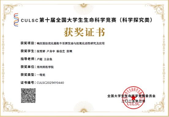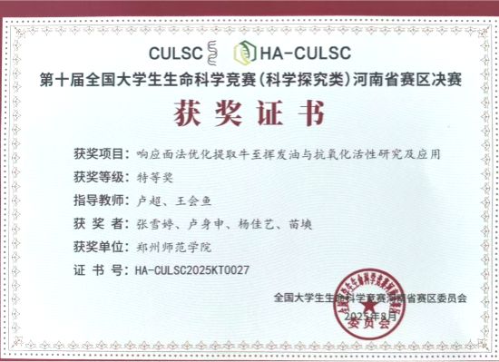 全国大学生生命科学竞赛教育部认定的国家A类竞赛中覆盖面最广、影响力最大的生命科学领域学科竞赛作为全国生命科学领域最具权威性和影响力的学科竞赛,本届大赛吸引了包括众多双一流高校在内的695所院校,2.1万余支队伍报名参赛学生达到8人,创下历史新高。比赛重在考察学生的原创能力、实验能力、团队合作能力、思辨能力及实验研究过程,竞赛级别高、参与人数多、完赛时间长、评审要求严。生命科学学院有2支队伍成功获奖《响应面法优化提取牛至挥发油与抗氧化活性研究及应用》荣获河南省特等奖、全国一等奖,《基于转录组和代谢组解析枣果肉质地差异形成的分子机理研究》荣获河南省等奖