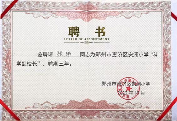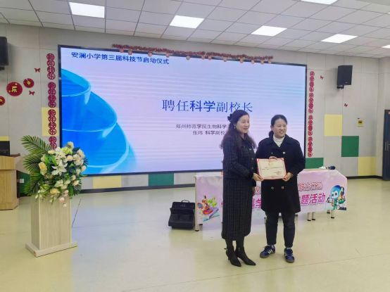 10 月 22 日,郑州市惠济区安澜小学第三届科技节启动仪式暨科学副校长聘任仪式顺利举行,我院教师张玮博士受邀出任该校科学副校长,以实际行动落实教育部关于 “每所学校至少有 1 名科学副校长”的政策要求。