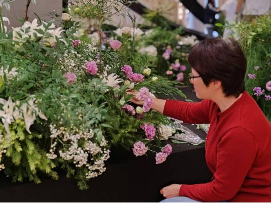 实践当天,同学们在田老师的现场统筹下分工协作,有条不紊地展开操作。从花材的修剪、养护,到花束的绑扎、花器的搭配,再到整体花艺装置的组装与现场调整,每一个环节都凝聚着大家的专注与巧思。面对现场空间结构与预想存在的细微差异,同学们在田老师的启发下灵活应变,及时优化设计细节,确保每一处花艺布置都与婚礼的整体氛围相得益彰,既展现了专业的设计水准,又传递出对新人美好爱情的真挚祝福。