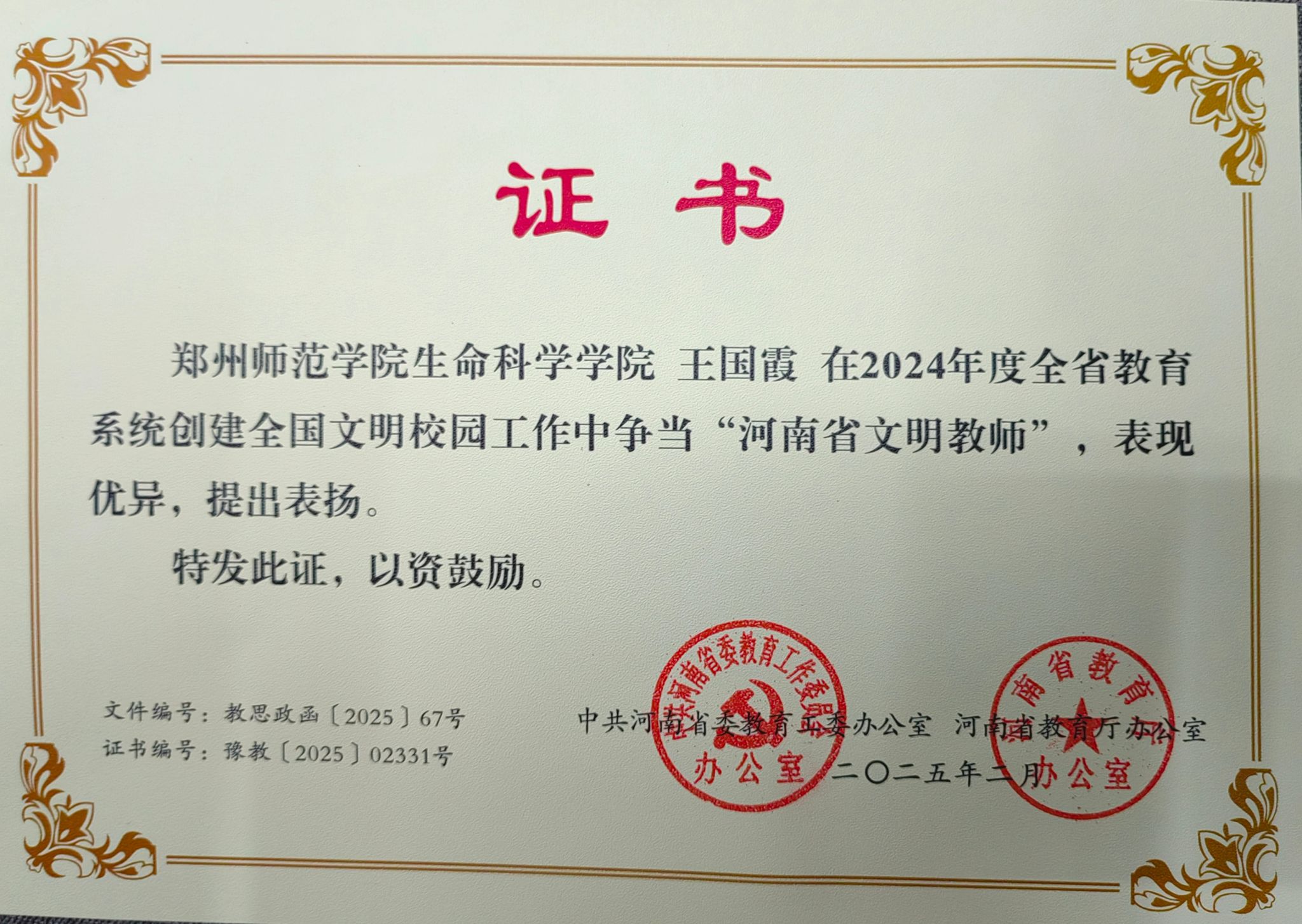 近日,河南省教育厅下发了《中共河南省委教育工委办公室河南省教育厅办公室关于对全省教育系统创建全国文明校园工作中涌现的先进集体和个人进行表扬的通报》(教思政函〔2025〕67号),我院副院长王国霞荣获2024年度“河南省文明教师”光荣称号。