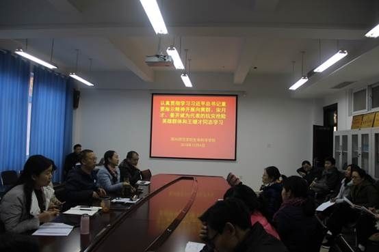 12月4日下午2:30,我院全体教职工在崇智楼301会议室召开会议,认真贯彻学习习近平总书记重要指示精神,开展向黄群、宋月才、姜开斌为代表的抗灾抢险英雄群体和王继才同志学习活动,党总支书记李坤陶主持活动。