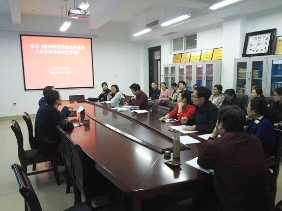 为扎实推进“迎评促建”工作,10月16日下午,我院全体教师在崇智楼301会议室,深入、系统学习《郑州师范学院本科教学合格评估知识手册》(以下称《手册》),党总支书记李坤陶主持了学习活动。