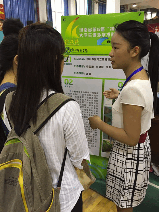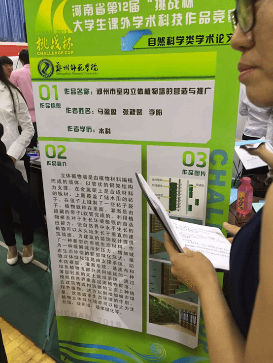 6月5日,第十二届“挑战杯”新开普河南省大学生课外学术科技作品竞赛终审决赛于郑州大学落下帷幕。我院历来重视学生科学创新能力的培养,调动学生参赛的积极性。学院以张秋馨、马盈盈、李盼、李玮玮、何佳佳、申丽娜、肖涵七名同学组成的团队所制作的B类自然科学类论文《植物室内立体墙的营养与推广》(指导老师:刘晓娟)通过校团委审阅与省预审,进入省级终审决赛。6月5日,我院作品在郑州大学南体育馆展示,参赛选手在现场进行了评委公开问辩。赛事竞争激烈,选手们表现出色,充分发挥勇于创新与挑战自我的精神,展现了郑州师范学院学生良好的风采和面貌。