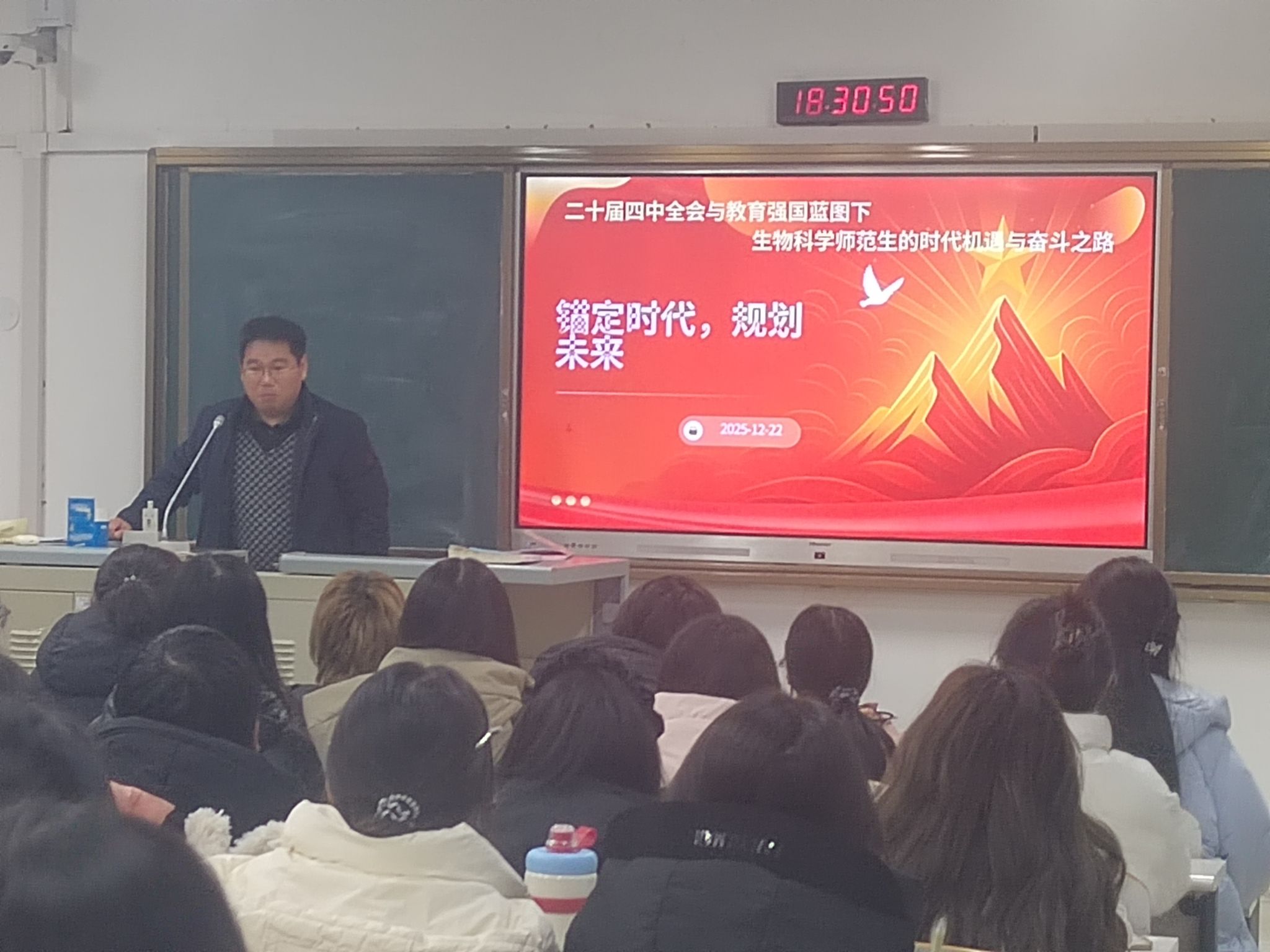 在党的二十届四中全会与教育强国蓝图下,生物科学专业的师范生应该怎样规划自己的未来呢?12月22日晚上,我院院长王林青在文汇楼319教室为同学们上了一节精彩的形势与政策课,2025级生物科学专业的全体同学聆听了课程。